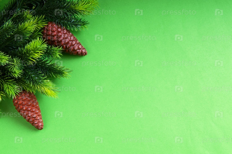 Еловые ветки с шишками на зеленом фоне