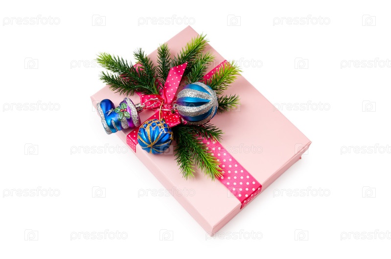 Новогодний подарок, украшенный лентой, веточками и игрушками