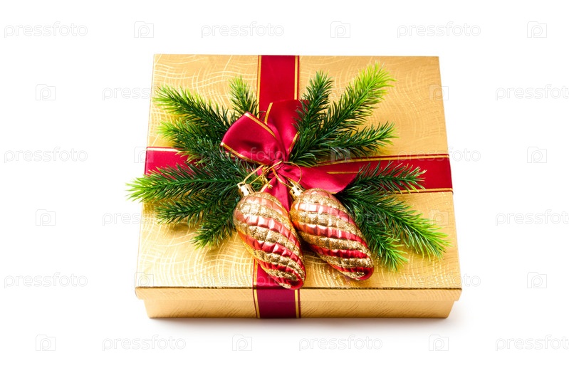 Новогодний подарок, украшенный лентой, веточками и игрушками