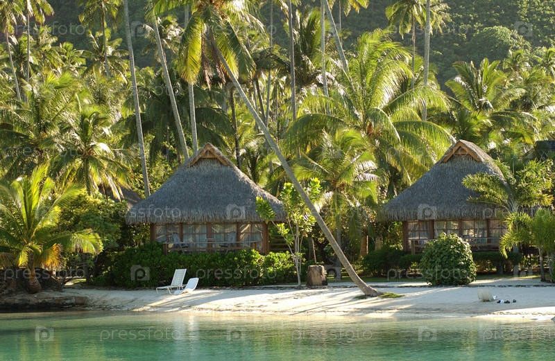 Соломенные дома на пляже, Муреа, Таити, Французская Полинезия, Южной части Тихого океана