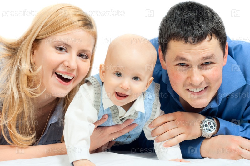 Счастливый семейный дом: отец, мать и ребенок лежат и улыбаются