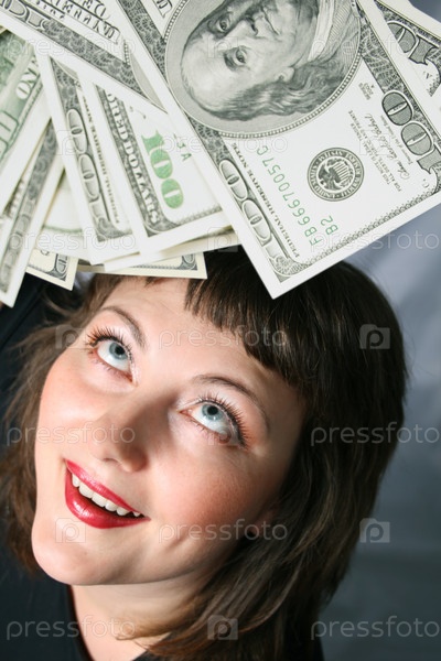 Радостная женщина держит доллары в руках
