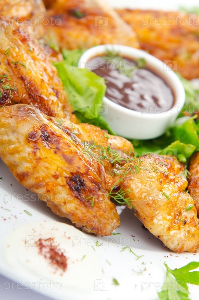 Куриные крылышки с соусом на тарелке крупным планом