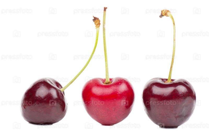 Три вишенки крупны планом, изолированы на белом фоне