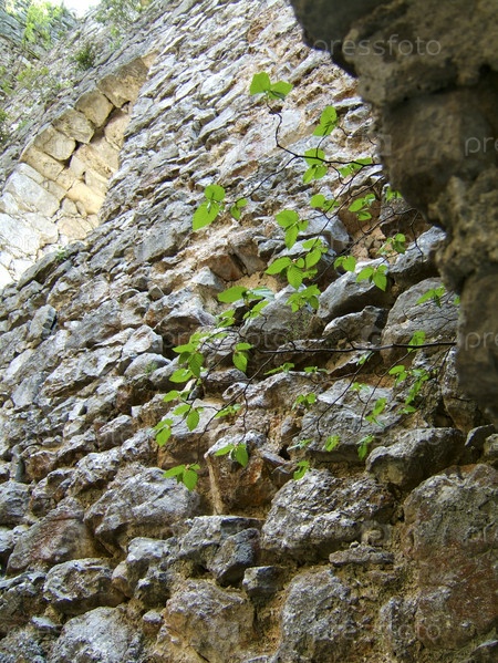 Старая каменная стена с зелеными листьями