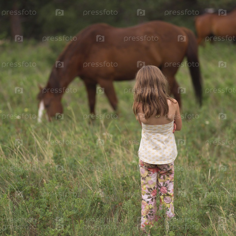 Маленькая девочка в поле с конем