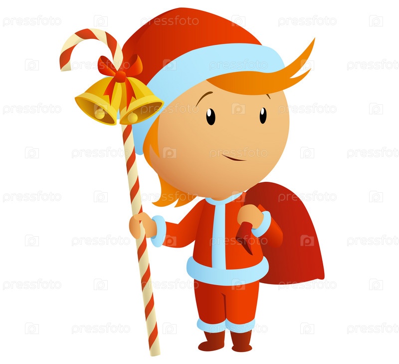 Маленький Санта с мешком подарков и посохом с колокольчиками, изолированный на белом фоне