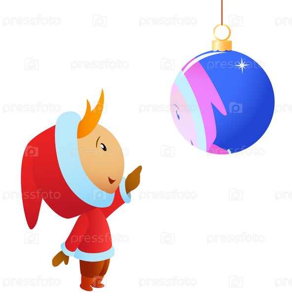 Малышка в новогоднем костюме смотрит на свое отражение в хрустальном синем шаре, изолированная на белом фоне