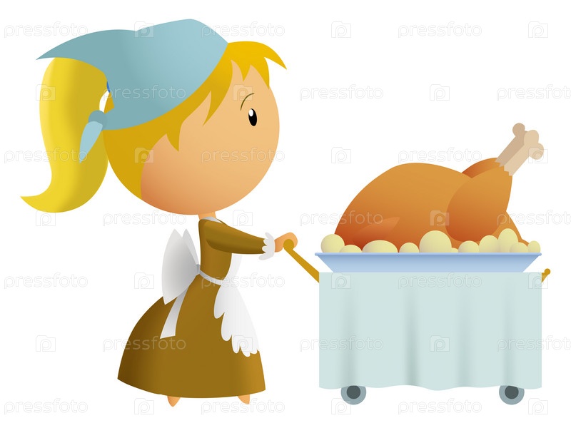 Домохозяйка в день благодарения везет на тележке приготовленную индейку, изолированная на белом фоне