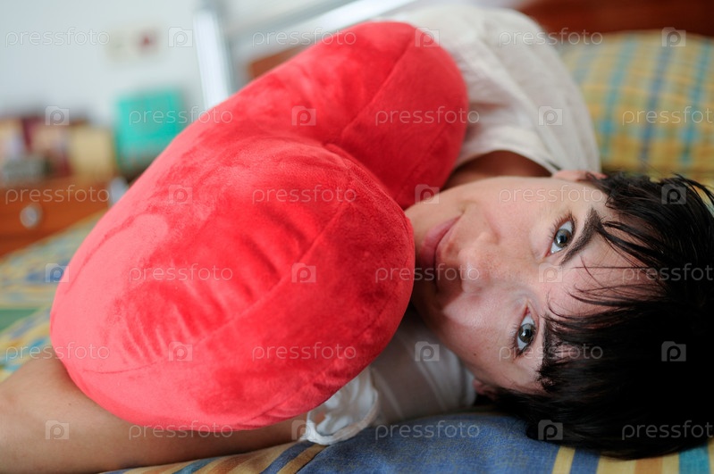 Женщина, держащая подушки в форме сердца