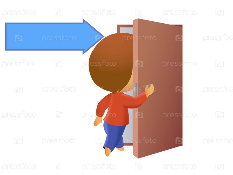 Мужчина входит через дверь в направлении синей стрелки, изолированный на белом фоне