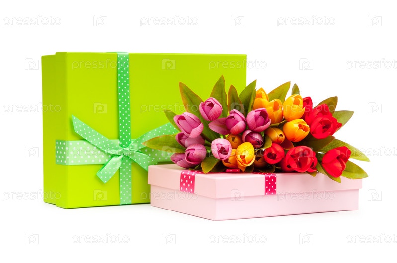 Букет тюльпанов и подарки