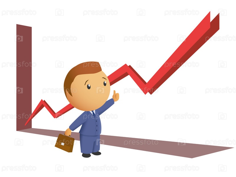 Бизнесмен перед большим красным графиком идущим вверх, изолированный на белом фоне