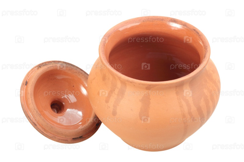 Керамический горшок с открытой крышкой. Изолированный на белом фоне