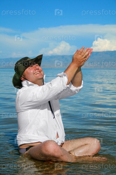 Мужчина сидит в воде в позе лотоса