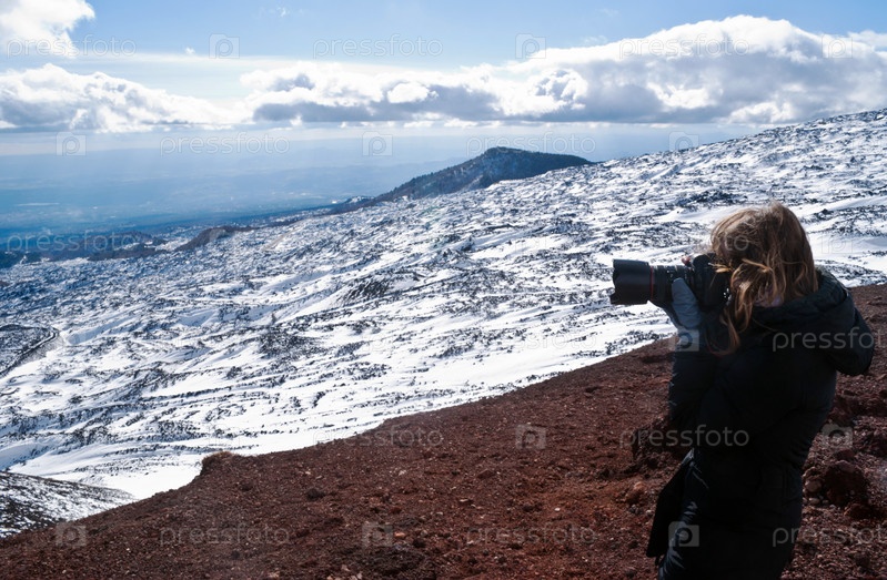 Девушка снимает снежный горный пейзаж