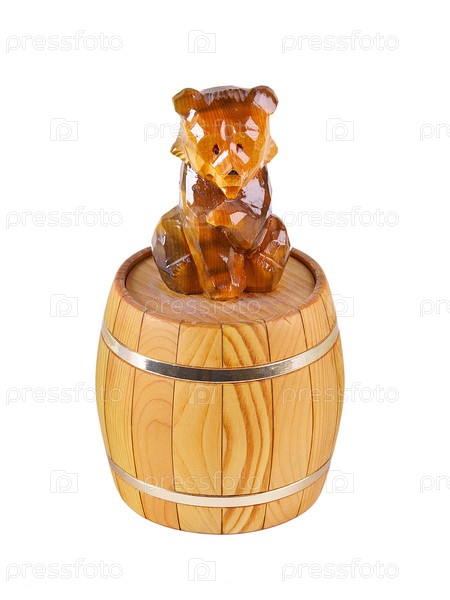 Деревянная сувенирная бочка с фигурой медведя на белом фоне