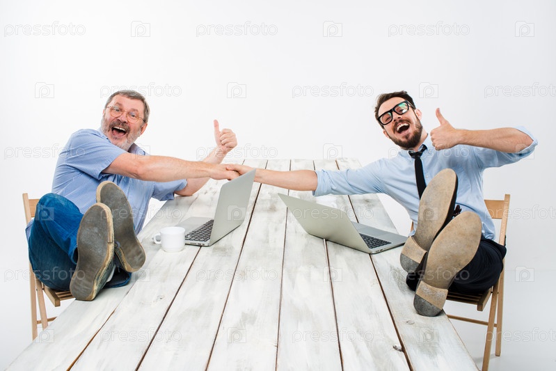 Два бизнесмена с ногами на столе, пожимают друг другу руки