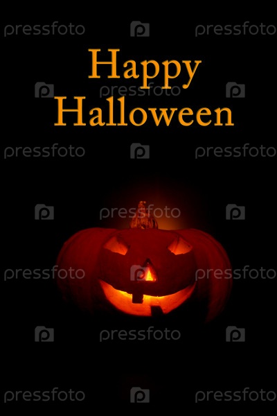 Светящийся тыквенник в темноте и надпись 'Счастливый Хэллоуин'