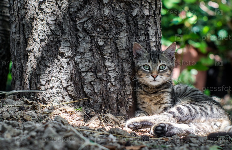 Красивая кошка сидит возле ствола дерева