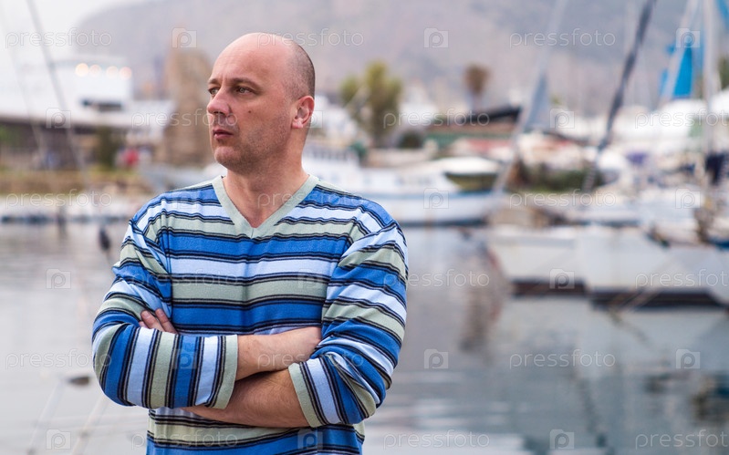 Бизнесмен, стоя у дорогих парусных лодок и яхт в прибрежном городе