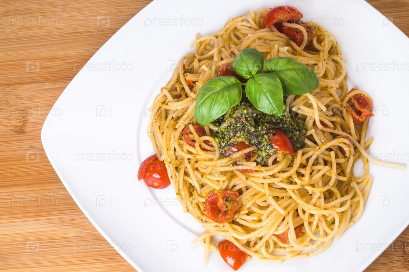 Спагетти с помидорами черри и соусом песто