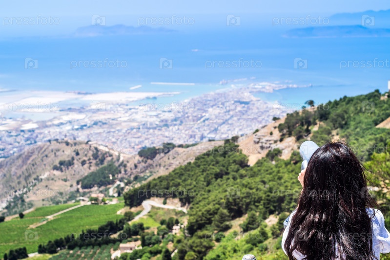 Девушка использовать телескоп для просмотра Сицилии от Эриче