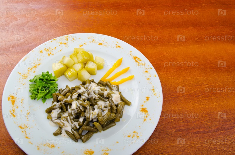 Зеленые бобы с зеленью и картофелем на тарелке