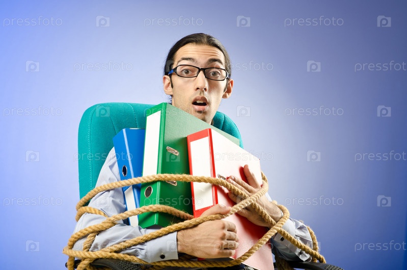 Молодой предприниматель с папками, связанный веревкой