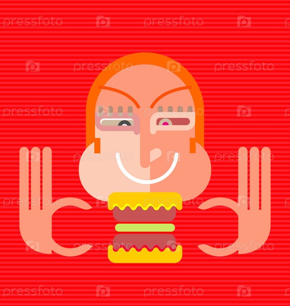 Толстый рыжий мужчина собирается съесть бутерброд, векторные иллюстрации на красном фоне