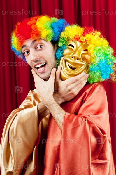 Портрет мужчины с театральной маской в руках на фоне красного занавеса