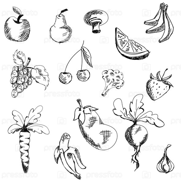 Рисованные фрукты и овощи. Векторные иллюстрации