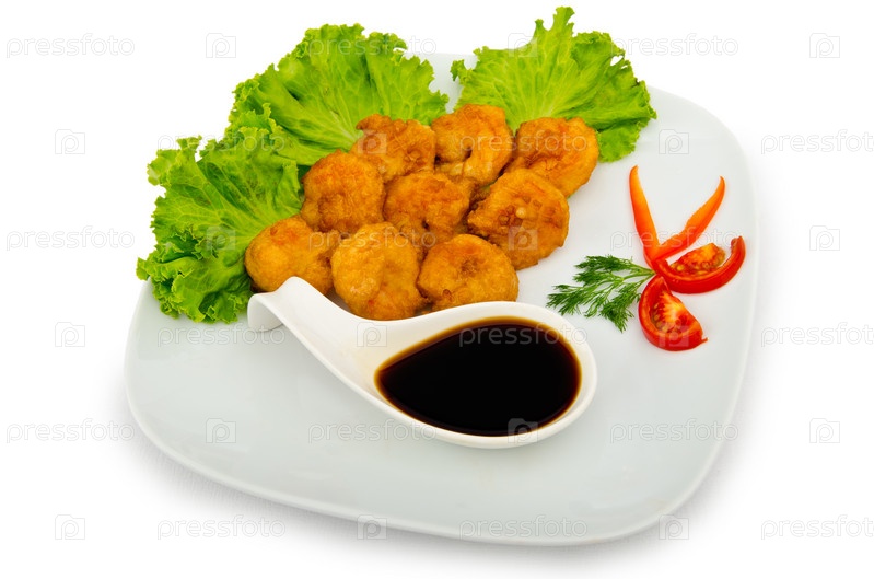 Кусочки жареной курицы с зеленью и соусом