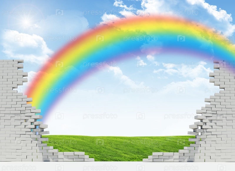 Пейзаж и радуга в сломанной стены