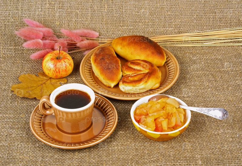 Тарелка с домашними пирогами, яблочным вареньем и кофе на холсте