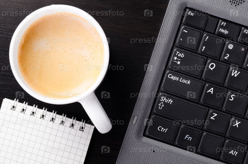 Ноутбук, чашка кофе и блокнотом на столе