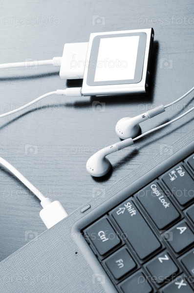 Ноутбук и современный музыкальный плеер на столе