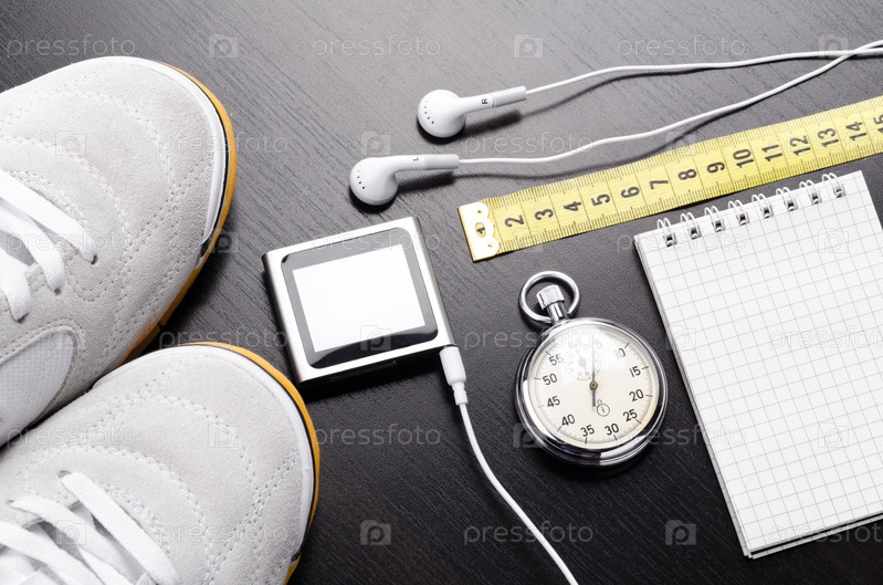 Кроссовки, часы и музыкальный плеер на столе