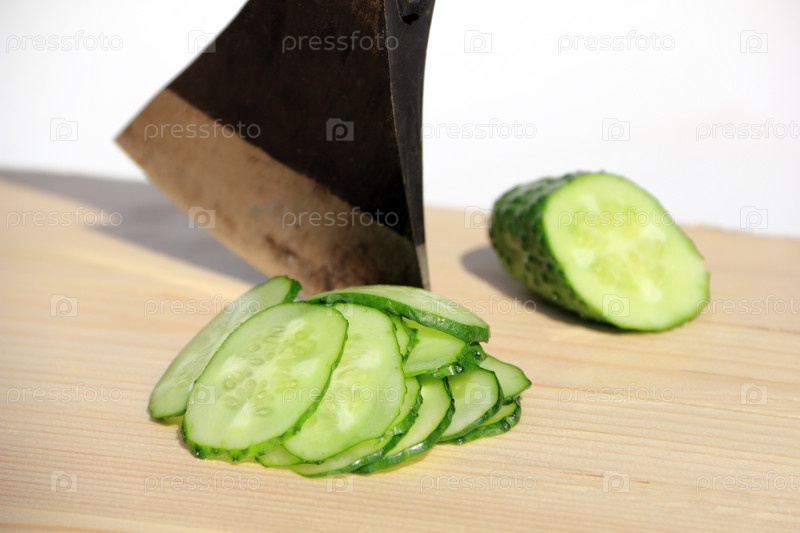 Топор и свежий огурец, нарезанный ломтиками