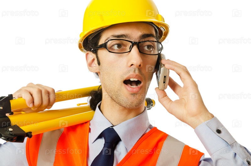 Молодой строитель в каске говорить по мобильному телефону