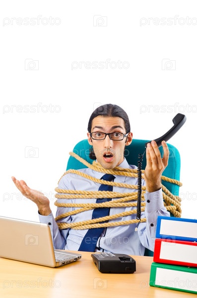 Молодой предприниматель, связанный веревкой, говорит по телефону