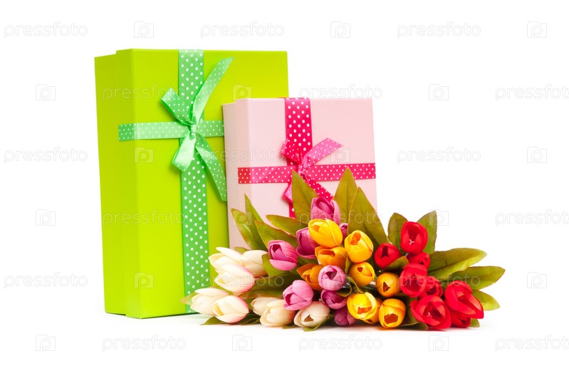 Подарочные коробки и тюльпаны на белом