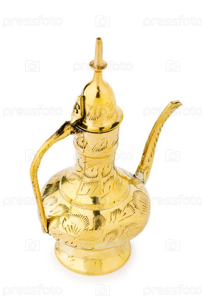 Древний восточный кувшин крупным планом, изолирован на белом