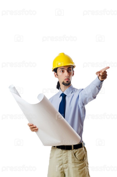 Инженер в каске с чертежами на белом