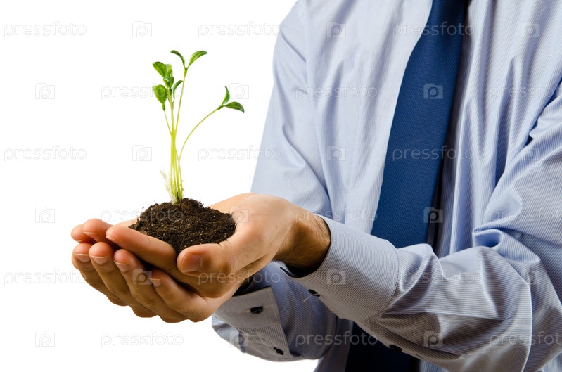 Бизнесмен держит зеленый росток в руках