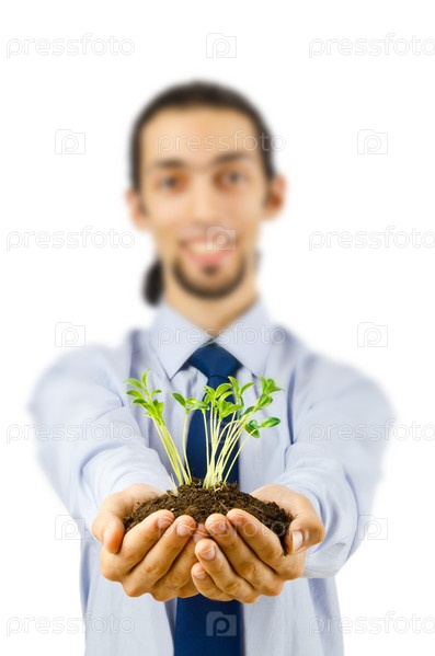 Бизнесмен держит зеленый росток в руках