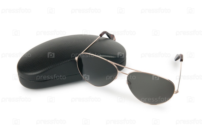Элегантные солнцезащитные очки и футляр на белом фоне
