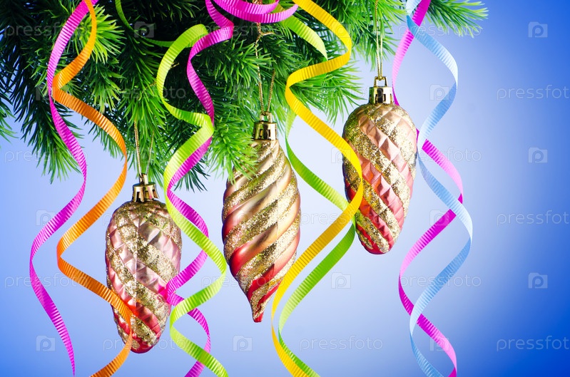 Елочные игрушки и серпантин на еловой ветке