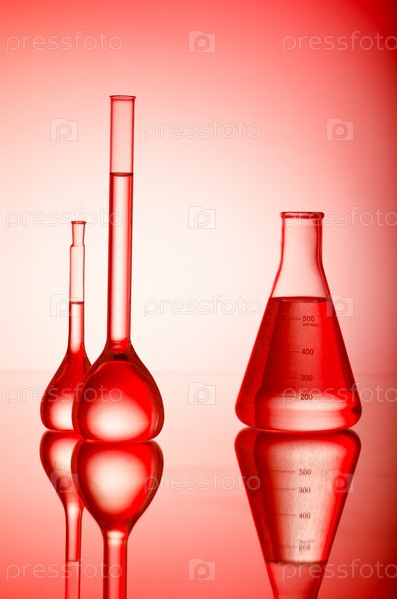 Химическая колбы на красном фоне