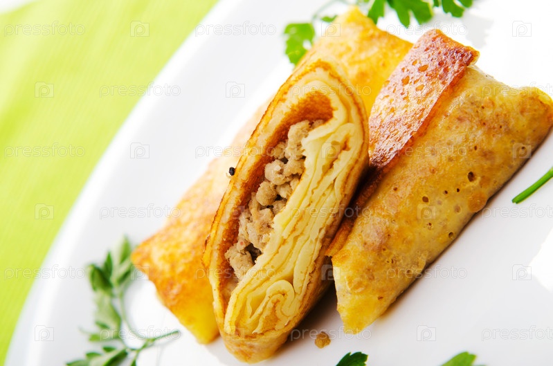 Блинчики с мясом на белой тарелке